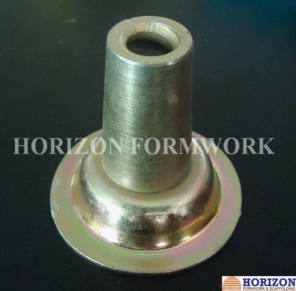 Steel cones are used for applications such as the construction of watertight concrete walls. The cones are supported at the inner side of the formwork and are fastened from the outside using a thread bar and a washer plate, flanged wing nut or equivalent accessories. Size accuracy of the formwork distance is achieved by using a lost tie rod (or with water stop).